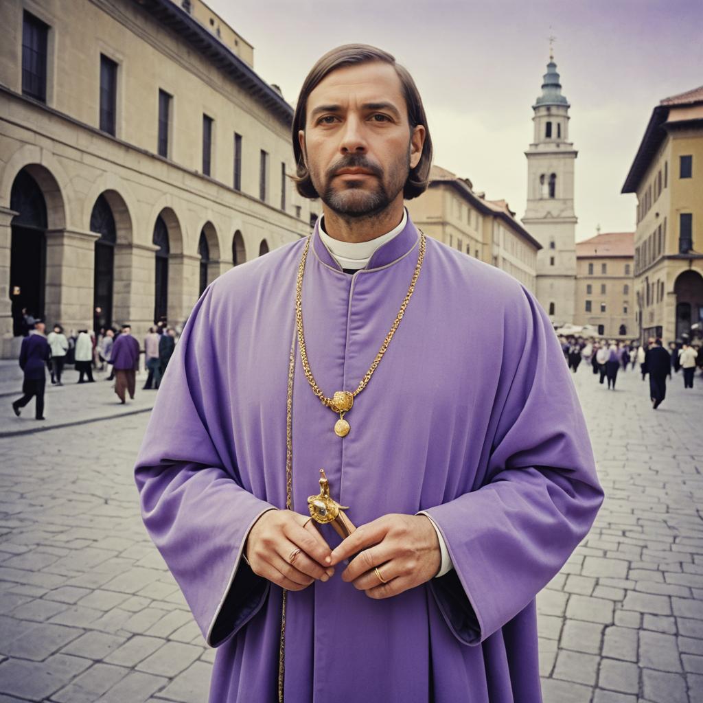 Portrait of a tall man dressed as a priest wearing a cashmere lavender robe with gold accessories including a large gold cross necklace and rings. He stands in a historic European plaza with vintage architecture and other clergy members in similar attire in the background.