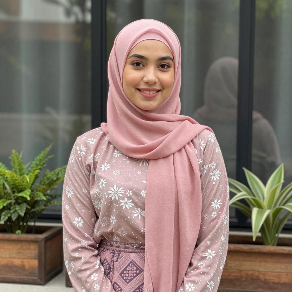 Photograph of a young woman with light skin and brown eyes, wearing a brown hijab and a cream-colored long-sleeve top. She is smiling slightly and looking to the side. Background includes green plants and a blurred garden area with a wooden door. She is seated on a gravel surface.