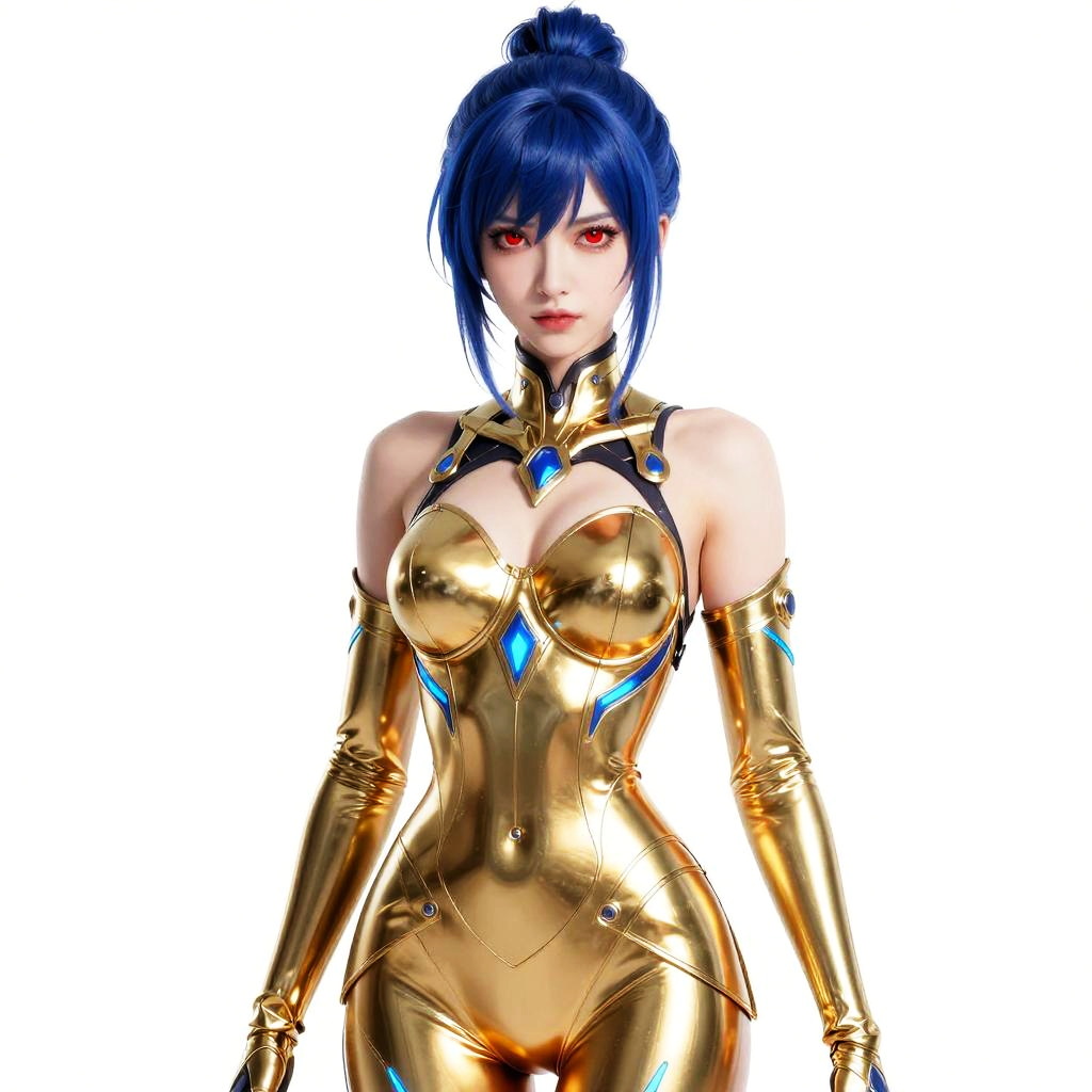 This is a digital illustration of a stunning, anime-style woman with pale skin and dark blue hair in a bun. She has striking red eyes and a serious expression. She's wearing a shiny, golden, metallic armor-like top that contours to her slim, curvy figure, with glowing blue accents. The background is pure white, making her stand out prominently. The art style is highly detailed and glossy, with a futuristic, sci-fi vibe.