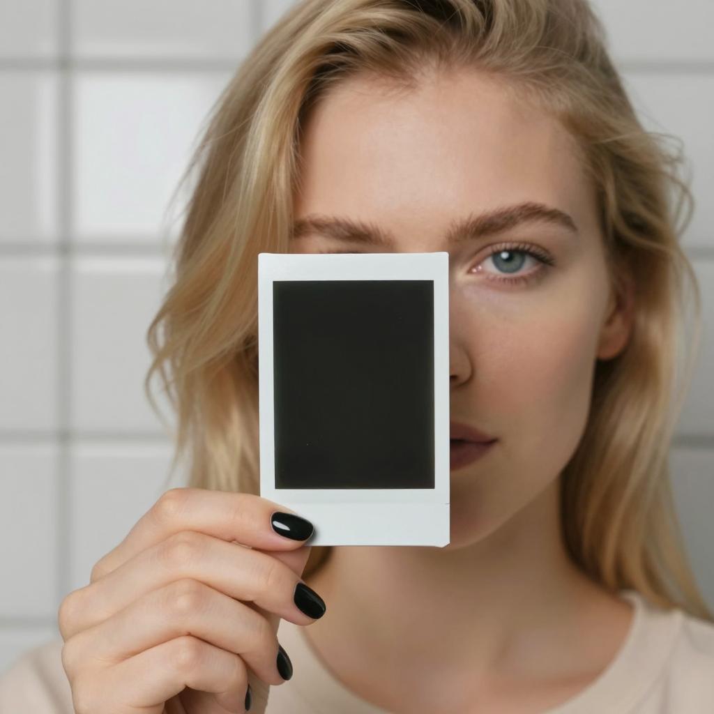 Close-up photograph of a blonde woman with fair skin and black nail polish, holding a Polaroid picture in front of her face. Her expression is serious, with a small light flare near the Polaroid. Background has blurred tiles and a soft light source. She is wearing a beige top. The Polaroid is black with white borders.