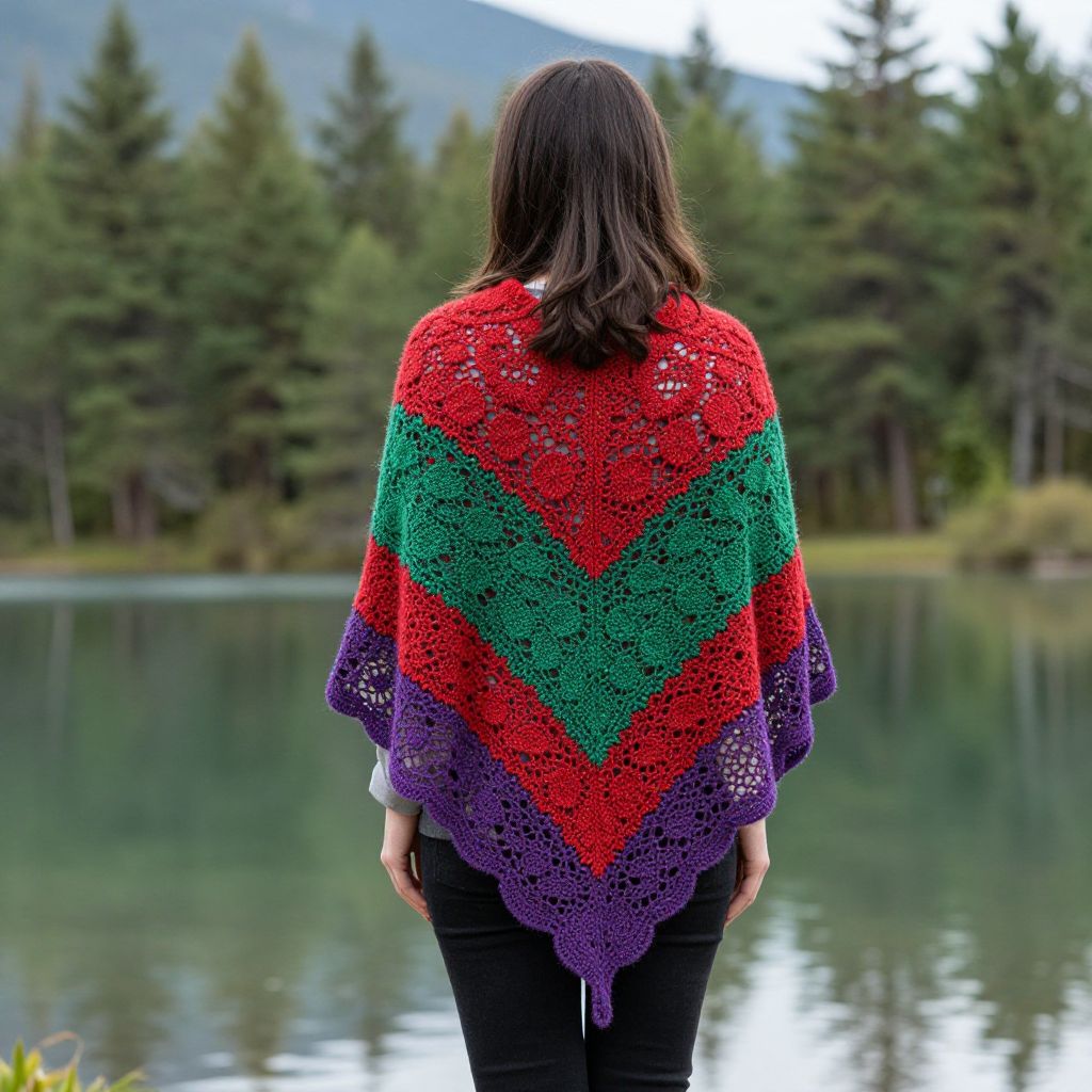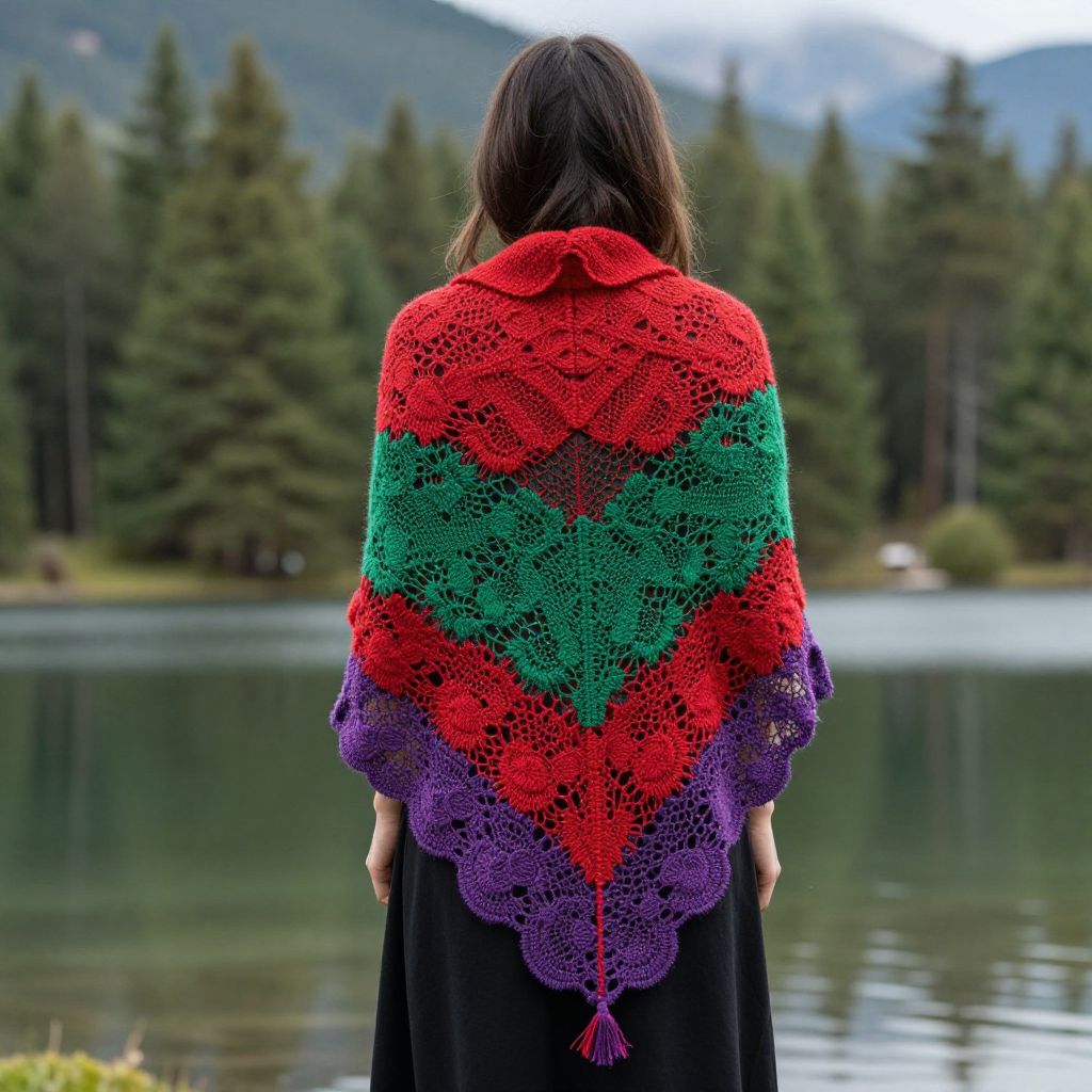 Handknitted red, green, and purple lace shawl gracefully drapes over a woman's shoulders as she stands by a serene lake, surrounded by lush evergreen trees and distant mountains.