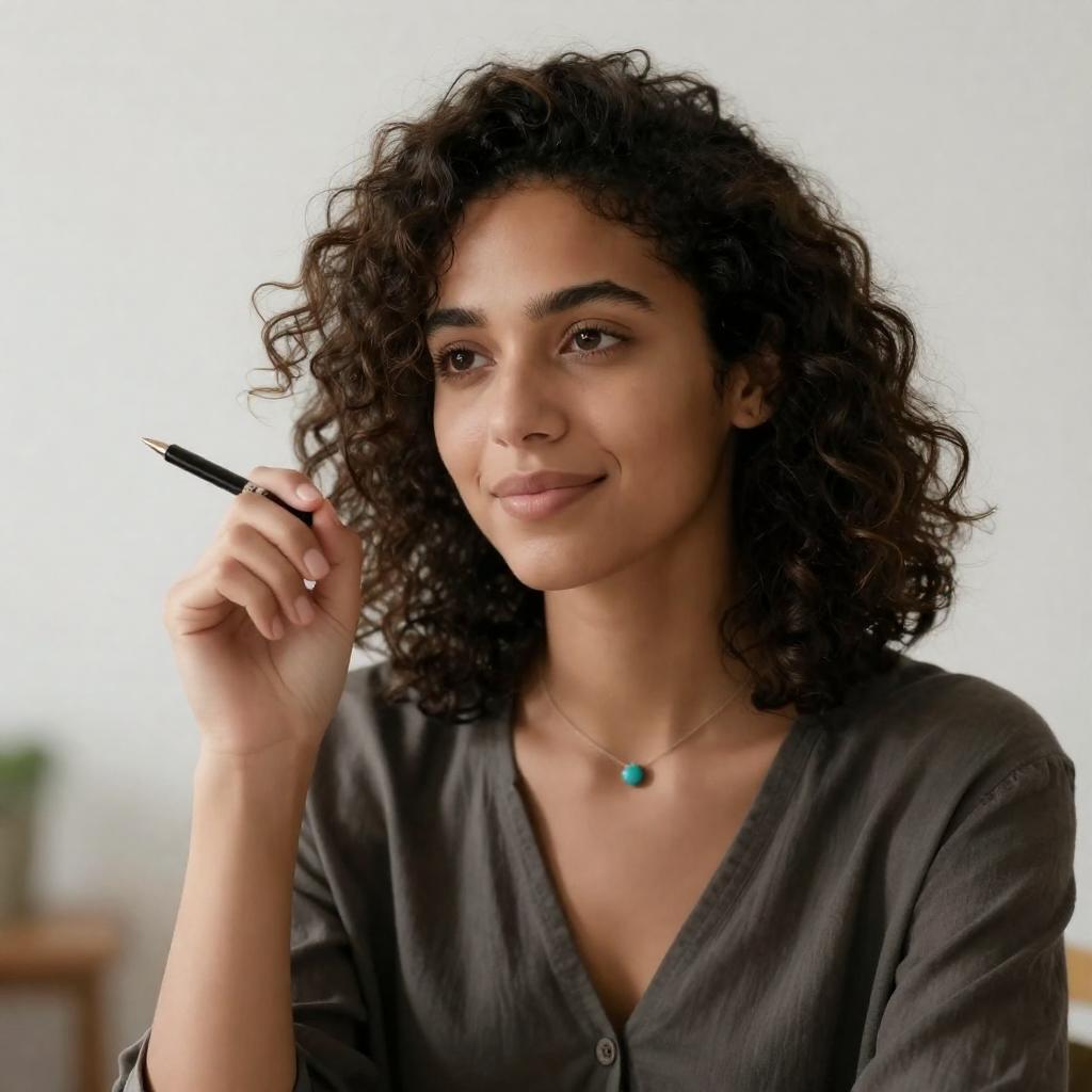 Photograph of a woman with curly dark hair, light brown skin, and a small turquoise necklace. She holds a pen in her right hand near her face, looking to the side with a slight smile. She wears a loose, dark shirt. Bright, overexposed background.