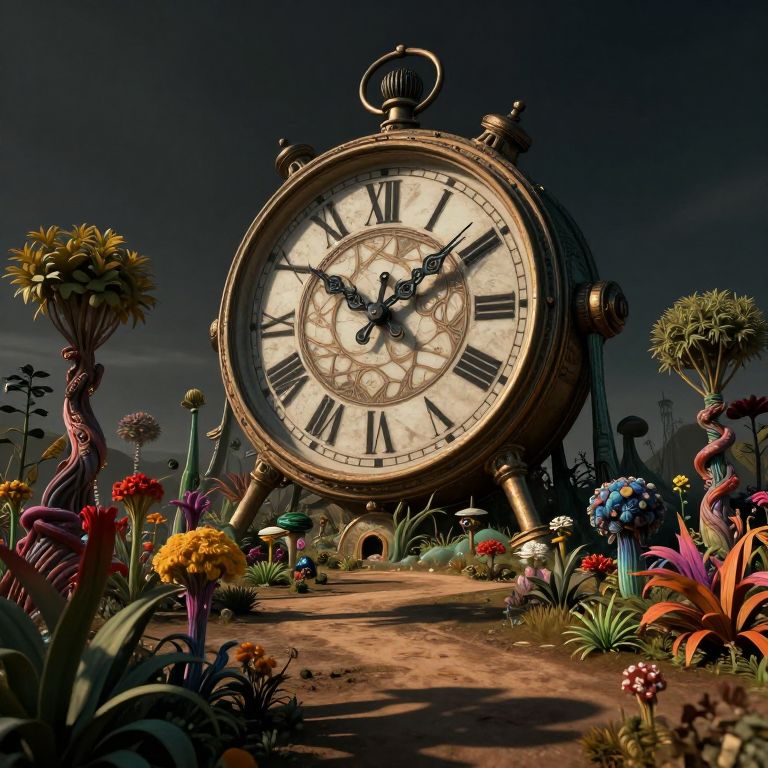 Imagine a surreal landscape where an immense, intricately designed timepiece appears to rise from the earth itself, capturing a moment when the concept of time seems to bend and warp around its towering form. This dream-like scene features a foreground filled with peculiar flora, their twisted shapes and vivid colors seamlessly blending into the clock's metal structure. The lighting should evoke mystery and intrigue, casting long shadows that stretch across the ground and create a rich chiaroscuro effect, inviting the viewer to explore the enigmatic relationship between nature and technology as these seemingly opposing elements become one in this fantastical vision.
