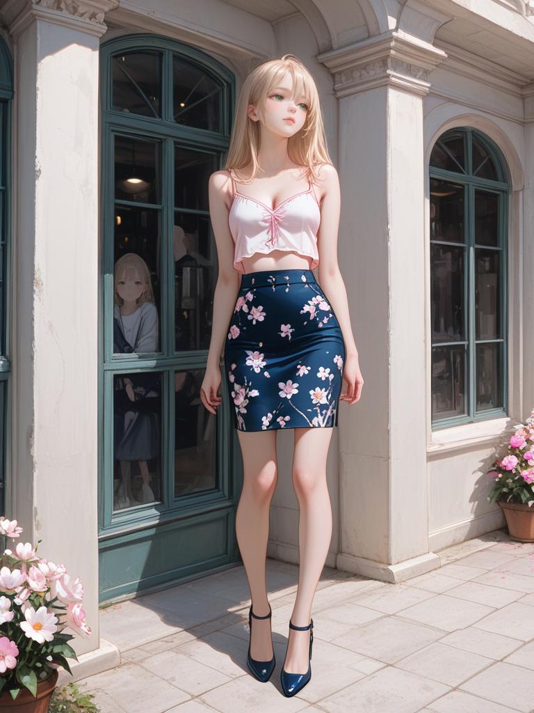 Realistic full-body portrait of a young woman standing outdoors near an elegant building with large windows. She is wearing a white sleeveless crop top with a slight ruffle hem and a navy blue pencil skirt adorned with pink and white floral prints. She has long blonde hair and is wearing navy high-heeled shoes. There are flower pots with pink blooms nearby.