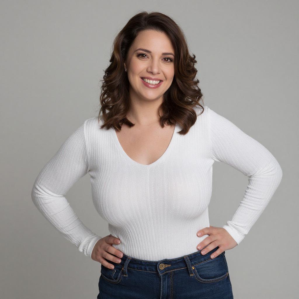 A confident plus size woman in her 40s with kind eyes, a naturally curly brown hairstyle, and a warm complexion dressed in a modest evening costume blending traditional elegance with modern flair — a long, structured dress with a subtle beaded embroidery and fitted sleeves — standing in a softly lit garden at sunset, with blooming roses and lanterns in the background.. The woman has big tits and cute face