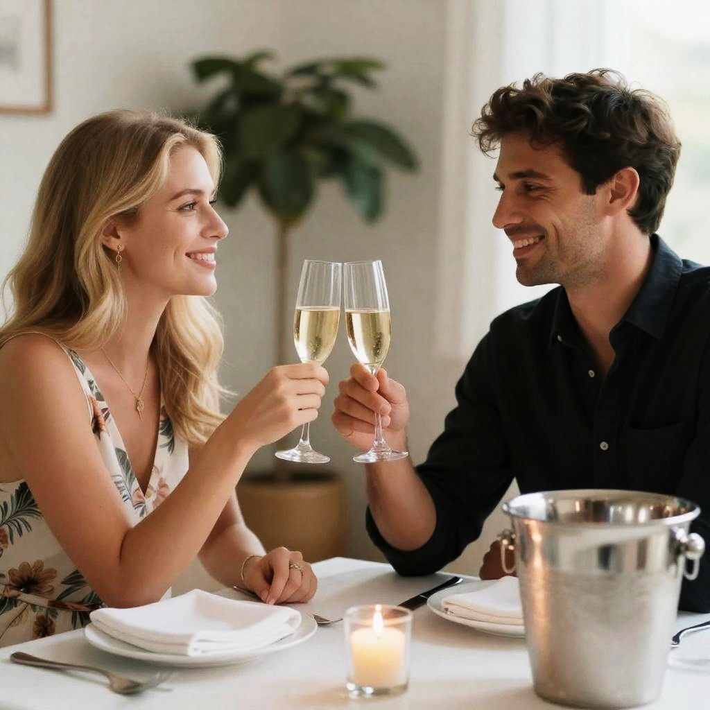 Photograph of a restaurant scene. A man with short brown hair, wearing a striped shirt, smiles while holding a fork, facing a blonde woman in a red sweater, who smiles back. They sit at a wooden table with a tray of appetizers between them. Two other people are partially visible in the background.
