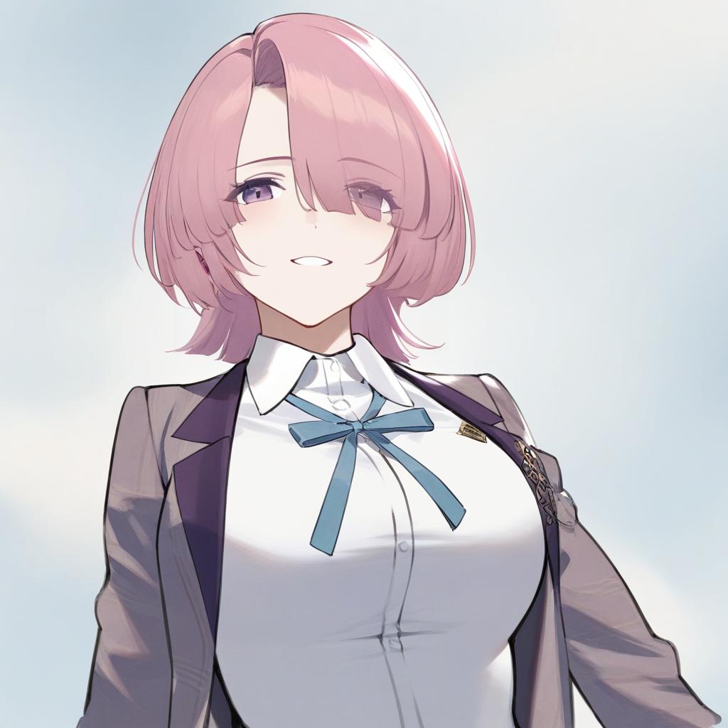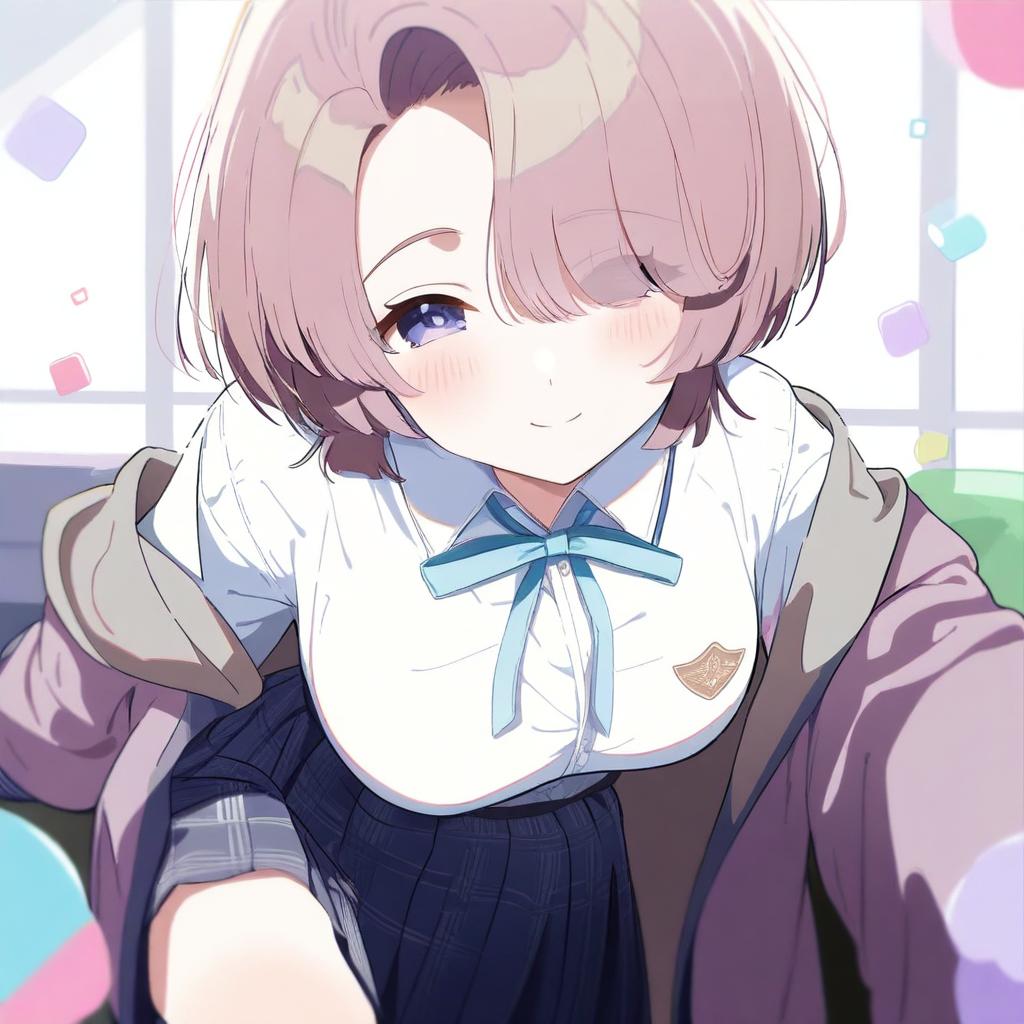 Arimura mao, gakuen idolmaster, 1girl, purple eyes, hair over one eye, pink hair, short hair, asymmetrical bangs, large breasts, medium breasts, school uniform, by artist porqueloin, animagine