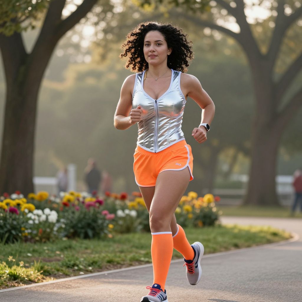 A fit and energetic woman with curly black hair and warm hazel eyes is wearing a custom-designed marathon costume complete with a shiny silver athletic vest, neon orange shorts, and knee-high running shoes, running through a scenic park at sunrise, with trees and flowers in the background, highlighting the bold and colorful female marathon attire.. The woman has big tits and cute face