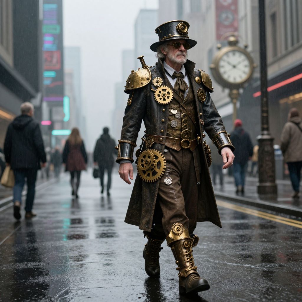 An elderly man adorned in a steampunk-inspired ensemble, featuring intricate gold gears and mechanical embellishments, strides confidently down a rainy urban street, blending seamlessly into a surreal, cyberpunk-inspired world where time flows like liquid and humanity navigates the tides of chronology.