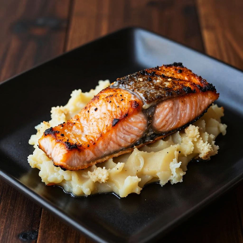 A close-up photo of a freshly cooked, whole fish with a golden-brown, crispy skin lying on top of roasted potatoes and mushrooms. The fish has a shiny, slightly oily texture with visible scales and a slightly open mouth. The dish is served in a white, speckled ceramic dish on a light wooden table, with bright, natural lighting highlighting the food's textures and colors.