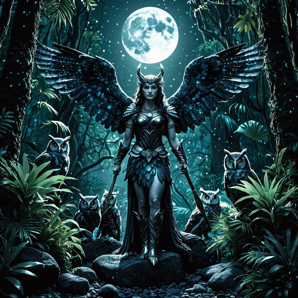 A digital fantasy artwork featuring a confident female warrior clad in shiny blue and gold armor, wearing a horned helmet. She stands against the backdrop of a large full moon illuminating a mystical forest with tall, bare trees and a vibrant twilight sky. The warrior has long flowing dark hair and a determined expression, embodying strength and bravery.
