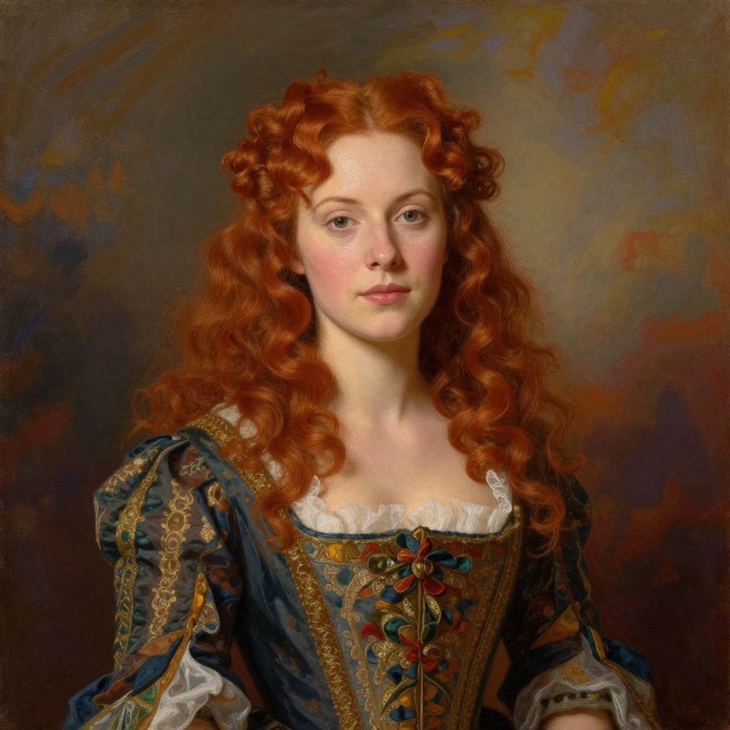 A painterly portrait of a woman with vibrant, curly red hair, wearing a detailed, historical dress, set against a dramatic, colorful background, reminiscent of classic art styles.