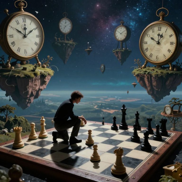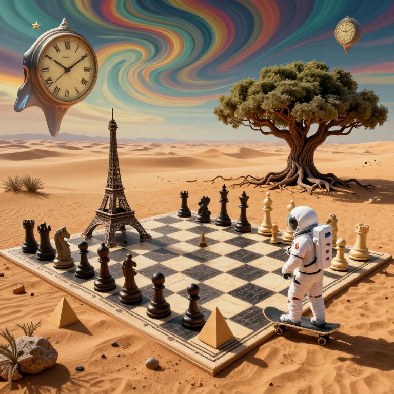 Visualize an abstract composition in the style of contemporary surrealist painting, portraying a surreal landscape where gravity appears to be defied. In this dreamlike scene, a colossal timepiece sprawls across a desert expanse, with its hands frozen at an impossible angle, casting elongated shadows that morph into ethereal, twisting beings. The background features a chaotic sky of swirling celestial bodies and galaxies, while the foreground is populated by geometric shapes reminiscent of chess pieces in various states of transformation – some merging with each other, others dissolving into pools of vibrant color. This captivating tableau evokes feelings of wonder, intrigue, and a sense of time's fluidity as viewers are drawn into this surreal world through this vivid, high-resolution digital art piece.