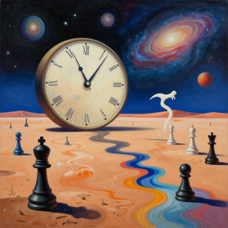 Surreal painting: giant clock in space, swirling rivers on desert, chess pieces, spiral galaxy, white silhouette, vibrant colors.