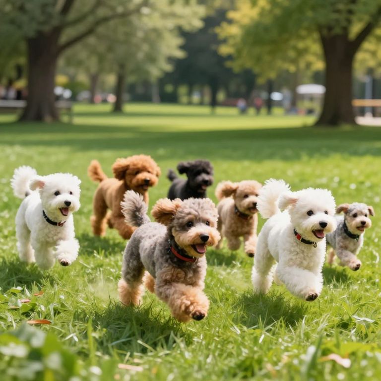 A group of lively cockapoos running through a lush green park, dynamic motion blur, bright sunny day, diverse colors and sizes, natural environment with trees and grass, vivid and energetic composition, high-detail digital art.