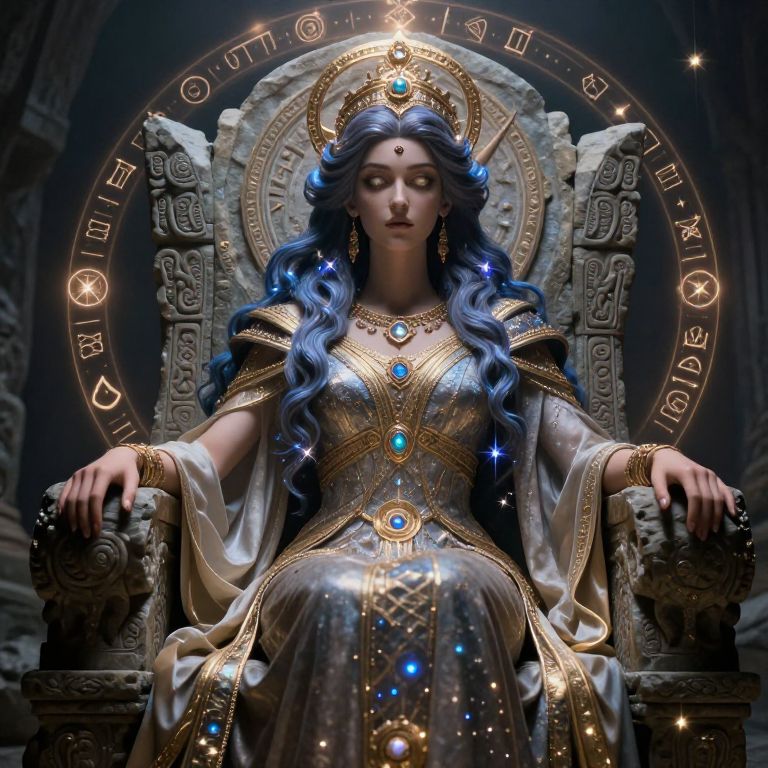 Theia goddess in a cosmic temple, glowing with divine energy, wearing a crown of sun and moon, vibrant celestial colors illuminating her serene face, surrounded by floating orbs of light