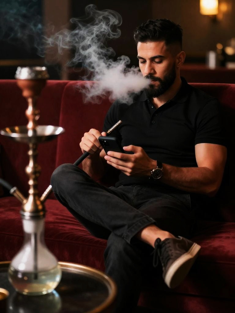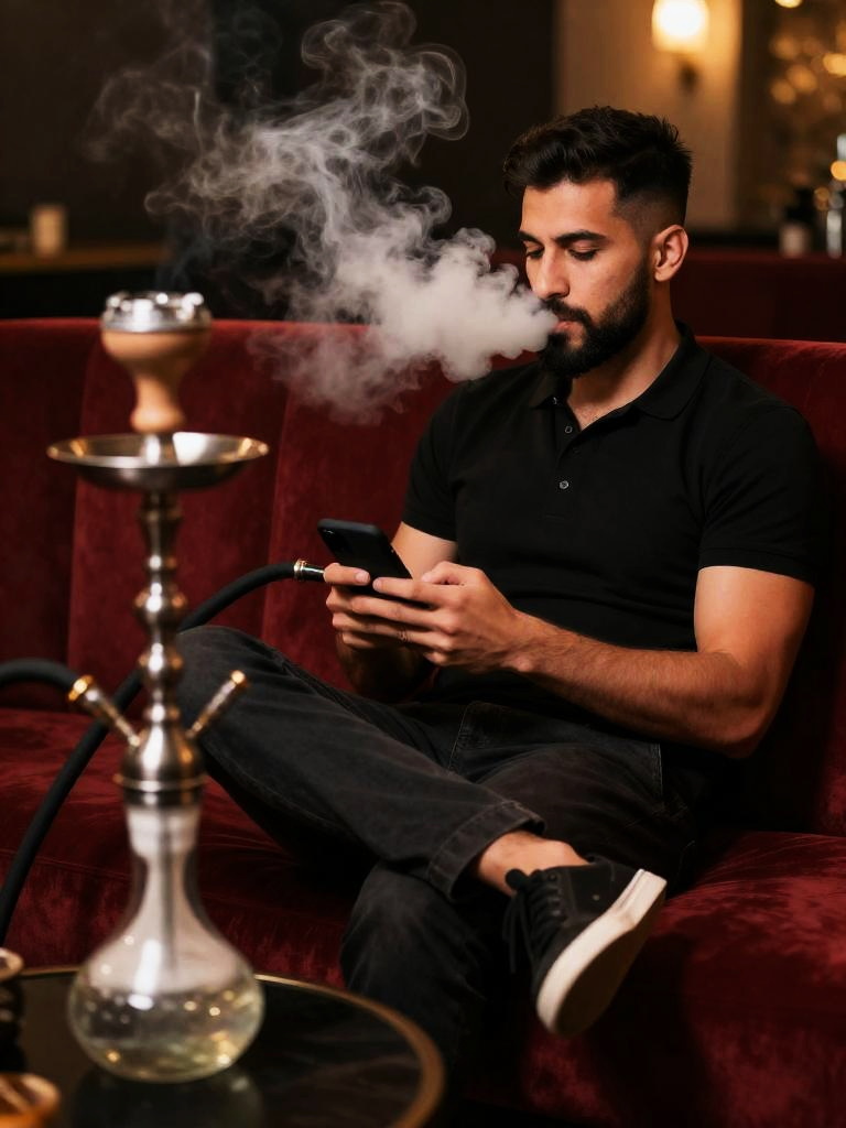 Man smoking shisha, relaxed adult man sitting on a plush sofa in a lounge, tan-skinned man with close-cropped beard and undercut hairstyle wearing black polo shirt and dark chinos, holding the shisha hose in one hand while looking at his phone in the other, dense cloud of smoke drifting from his mouth, ornate hookah with glass base placed on a low table in the foreground, rich warm lighting, deep red upholstery, cinematic lifestyle photo, realistic, high resolution