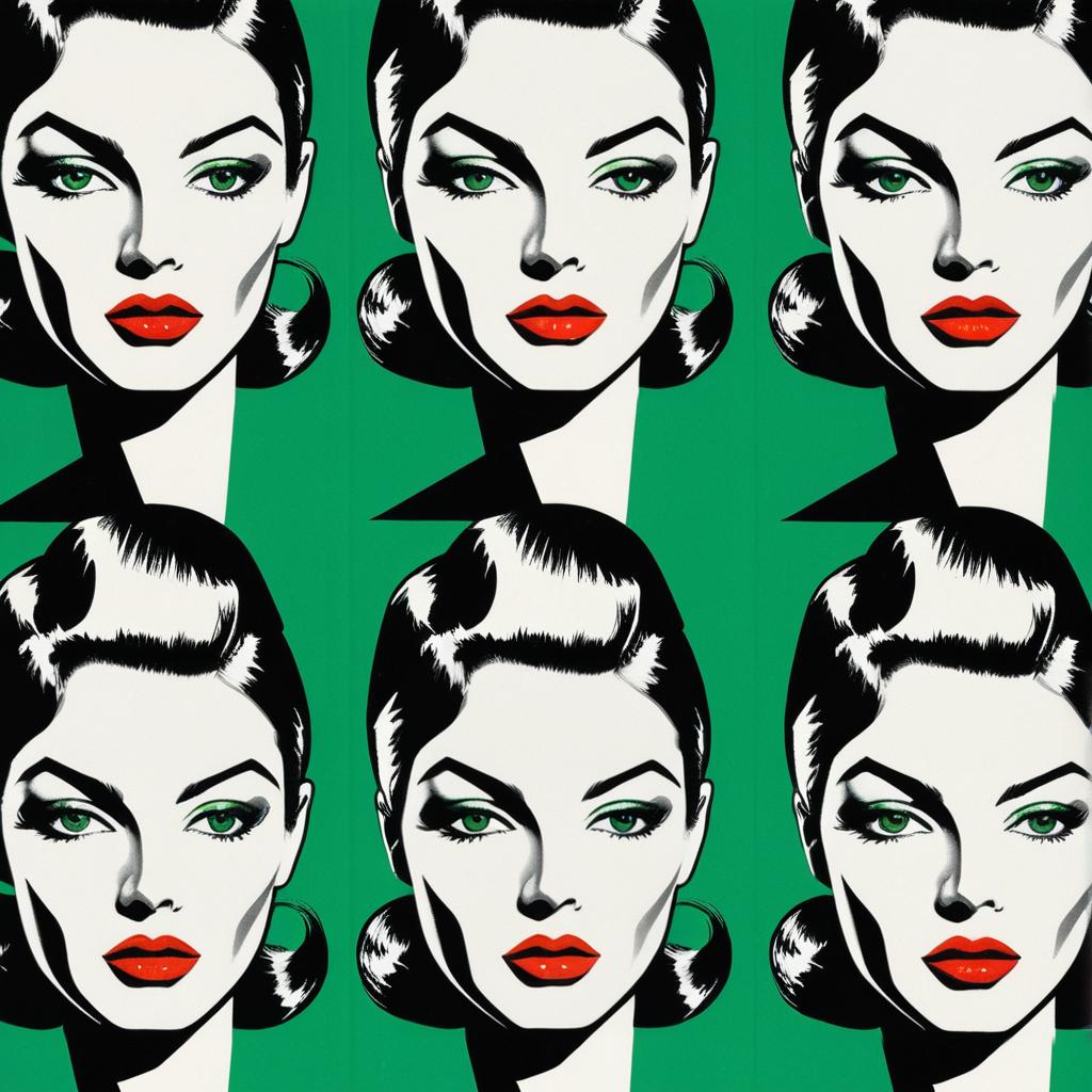 Man with bright red lips in a modern pop art print illustration style, featuring multiple repeated prints. Very bright colors, geometric forms, and a 1960s spy movie action pose in 2D, capturing a dynamic and iconic pop art look.