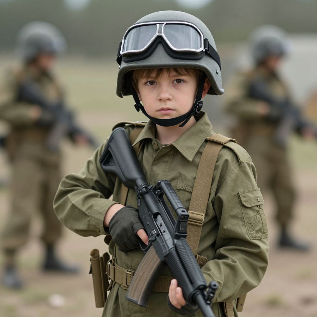 Photograph of a young boy in military gear, including a helmet with goggles, holding a black rifle, standing in a field with blurred soldiers in the