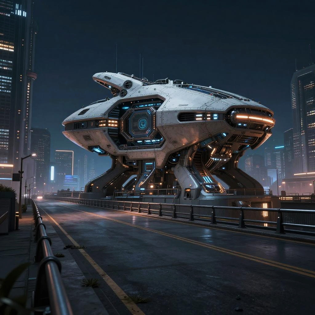 Cinematic shot of a sleek spaceship parked in the middle of a dystopian city, volumetric fog, volumetric lighting, landing gear