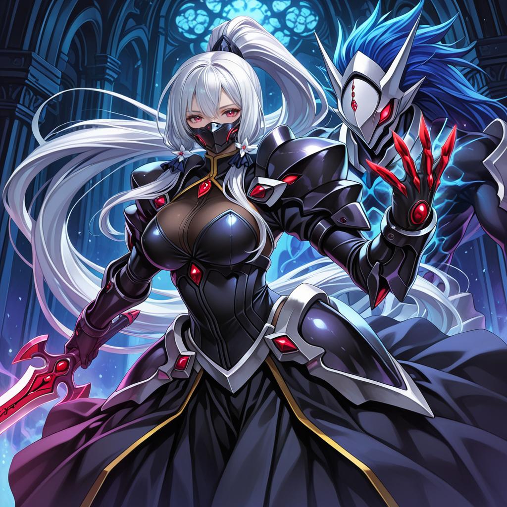 Hakumen, blazblue, 1boy, long hair, very long hair, blue hair, white hair, ponytail, armor, armor, mask, sword, by artist kouda tomohiro, dark_illustrious