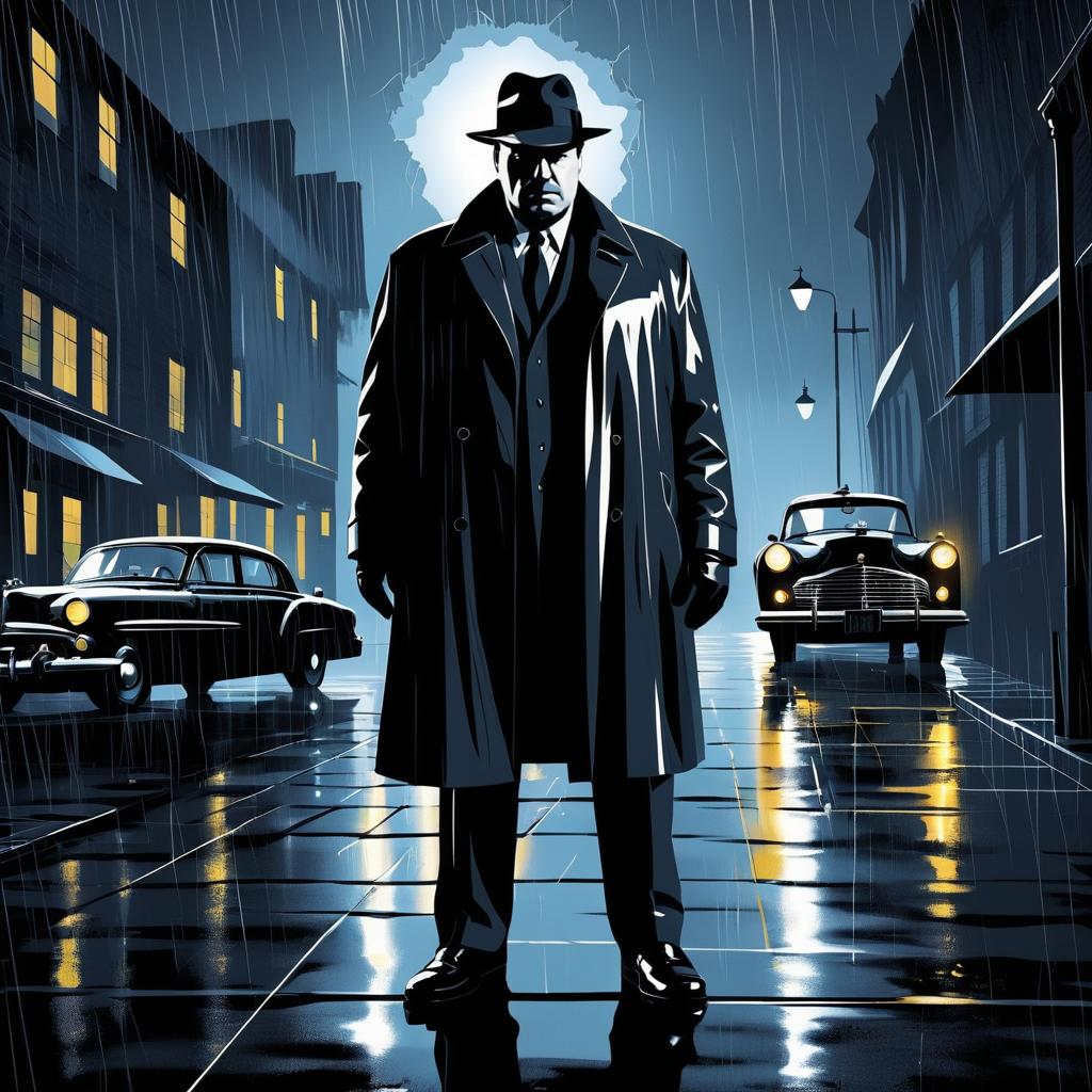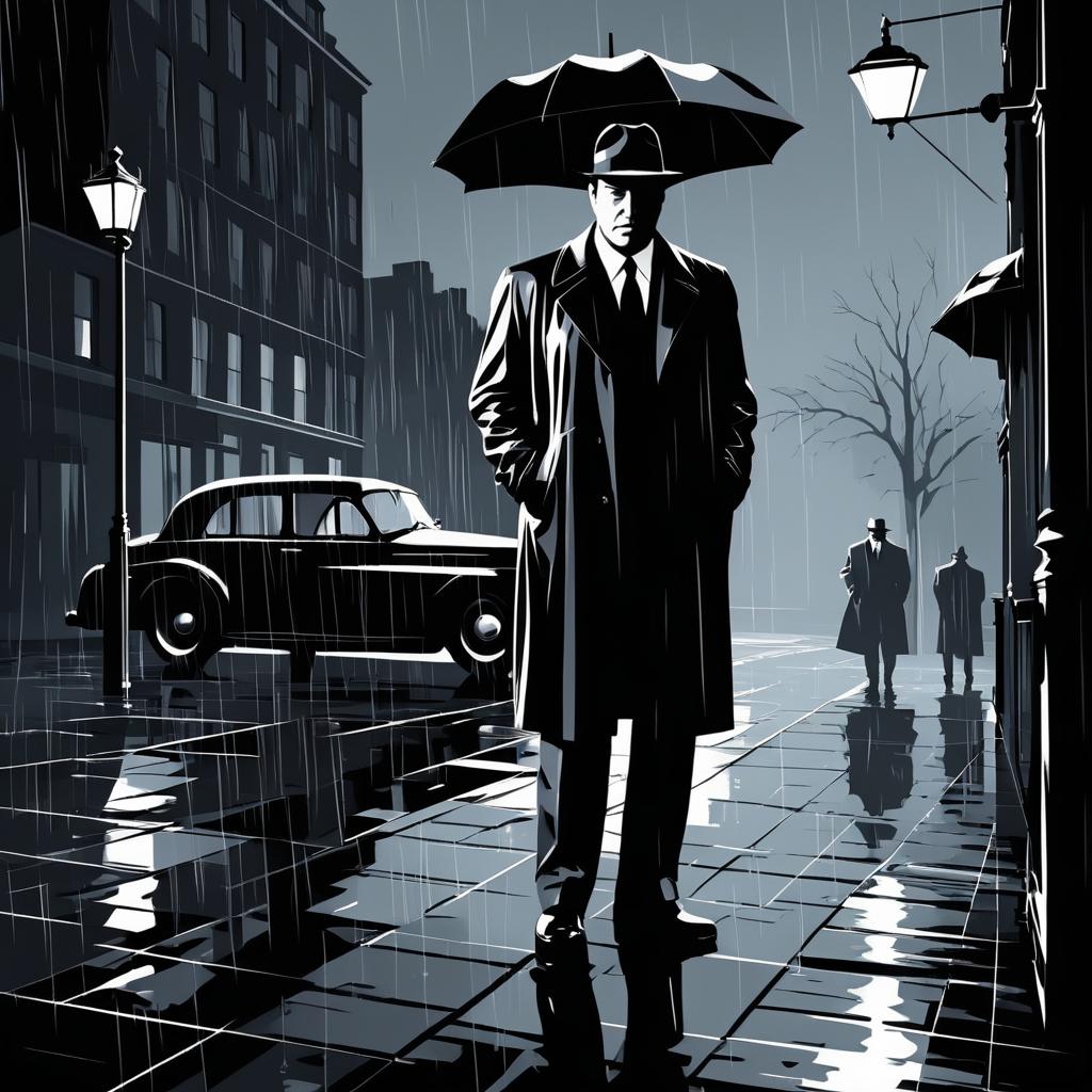 Stylized illustration of a detective in a classic trench coat and fedora holding an umbrella, standing on a rain-soaked city street. The scene features vintage cars, dim street lamps, and a moody, noir-inspired atmosphere reminiscent of Alfred Hitchcock's style, evoking a suspenseful and nostalgic crime investigation setting.