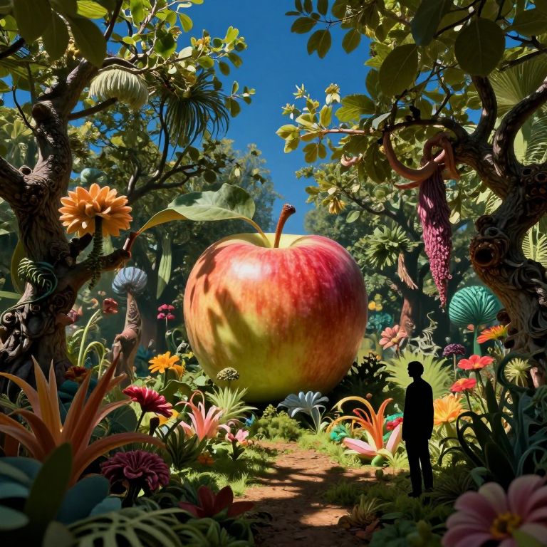 This vivid, surreal CGI illustration depicts a fantastical garden scene with a gigantic, red and yellow apple at its center. Surrounding the apple are lush, colorful flowers, including orange, pink, and purple blooms. Tall, twisted trees with textured bark and large leaves frame the image. A small, silhouetted human figure stands to the right, gazing at the apple. The background features a clear blue sky, enhancing the vibrant greenery. The scene combines realistic textures with whimsical elements, creating a dreamlike atmosphere. The overall composition is rich with contrasting colors and textures.