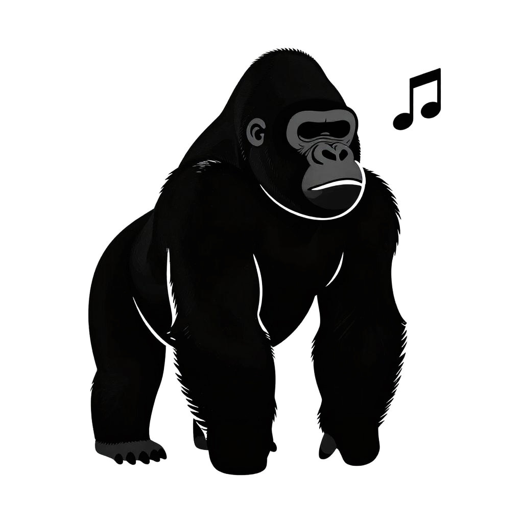 A black silhouette of a large gorilla stands on all fours, facing right. The gorilla has a small, white, toothy grin and a single musical note hovers near its head. The background is plain white, creating a stark contrast with the bold black figure. The image is simple and stylized, focusing on the gorilla's form and the musical note.