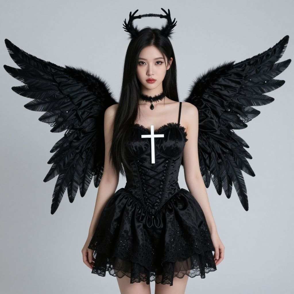 Midnight Fairy Costume, woman dressed in a black costume with wings and a cross