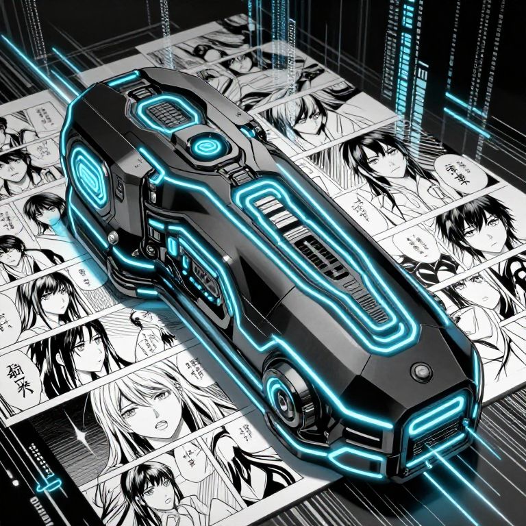 Digital anime-style illustration of a glowing blue neon futuristic car hovering over black-and-white manga-style character panels with dynamic lines.