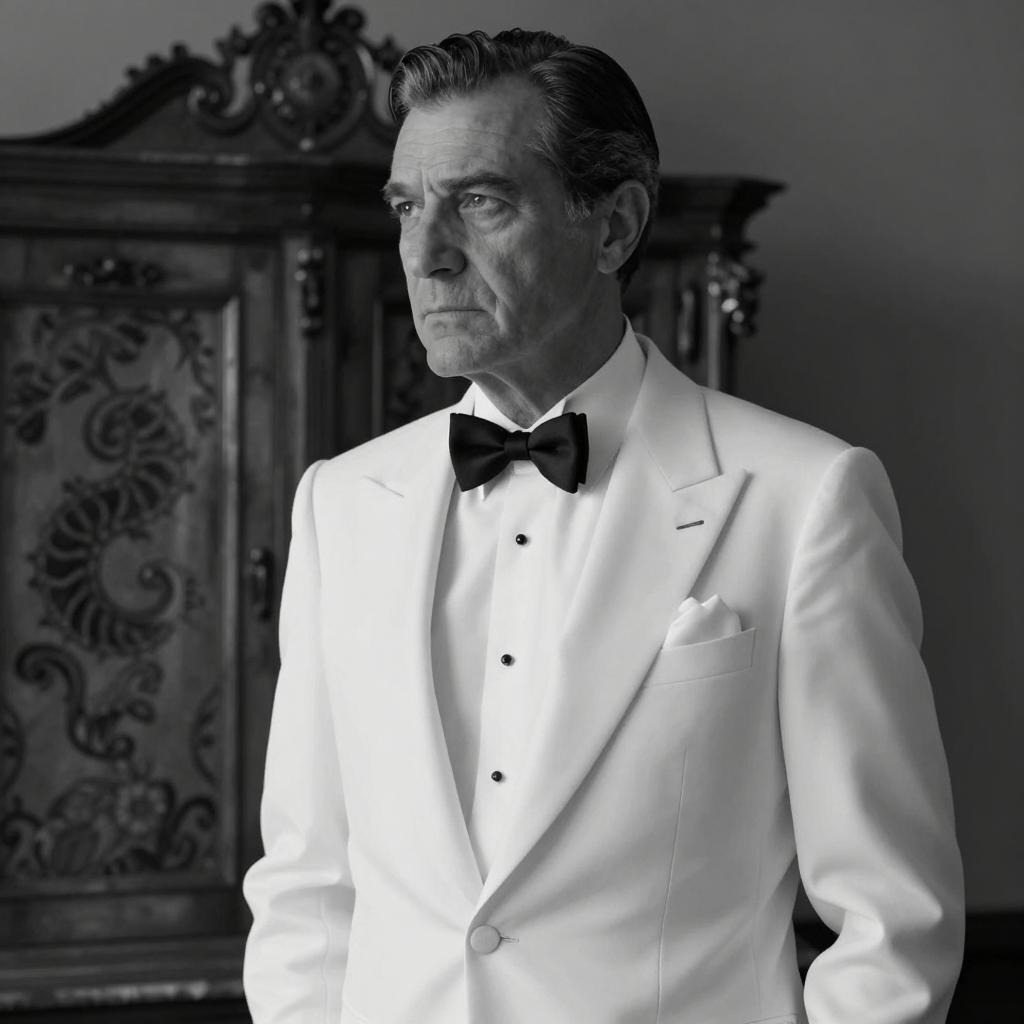 Black and white photograph of a middle-aged man with dark, slicked-back hair wearing a white tuxedo, black bow tie, and white pocket square. He stands in front of an ornate, patterned cabinet with his head slightly tilted, gazing to the side. Background is dimly lit with shadows. Man's expression is serious and contemplative.