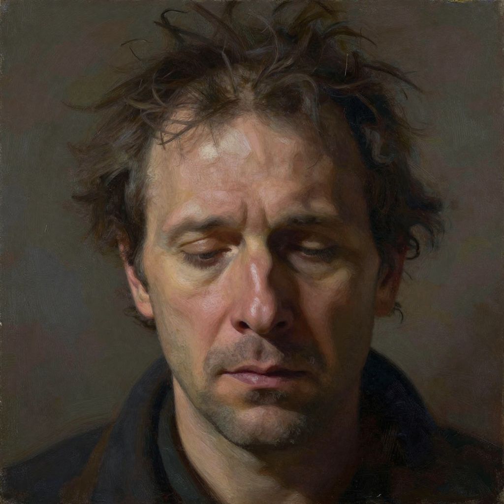Portrait of a distraught face, middle-aged man with disheveled hair, strong shadows emphasizing grief and despair, painterly texture, somber atmosphere, muted color palette