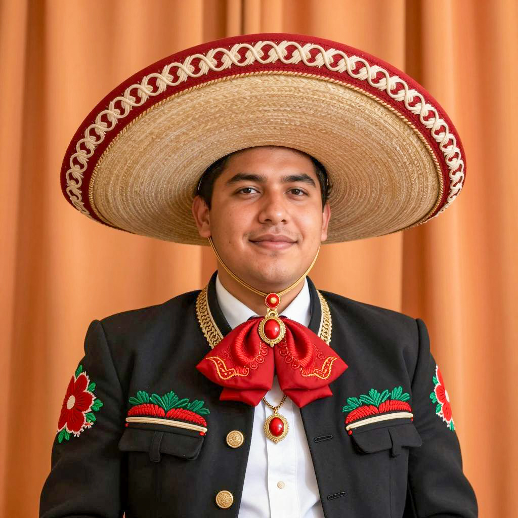 Mexican party outfit, photograph of a young man with short dark hair, wearing a large traditional Mexican sombrero, black embroidered jacket with red and green floral patterns, white shirt with a red cravat, gold necklace with red pendant, standing in front of orange draped curtains, smiling, medium skin tone, symmetrical face, portrait style, detailed ures, bright colors, cultural attire, festive, daytime, realistic, close-up.
