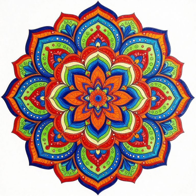 Vibrant mixed media mandala featuring a symmetrical floral design with concentric layers of intricate patterns, bold colors including blue, green, orange, and red, and ornate details radiating outward from a central orange flower motif.