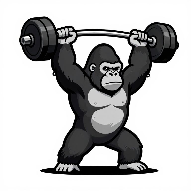 Cartoon-style illustration of a muscular black and white gorilla lifting a heavy barbell overhead, standing on a white background.