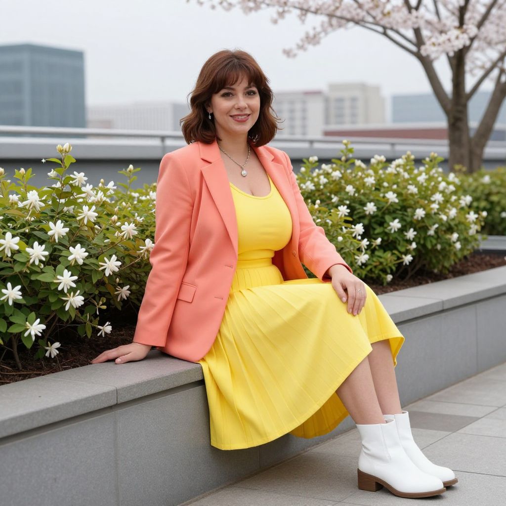 A vibrant woman with brown eyes and a friendly smile, wearing a spring casual outfit redesigned as a playful costume—bright yellow pleated skirt, soft coral blazer, and white ankle boots—sitting on a rooftop garden in an urban setting with blooming jasmine and cherry trees, detailed, realistic photorealistic style. The woman has big breasts and cute face