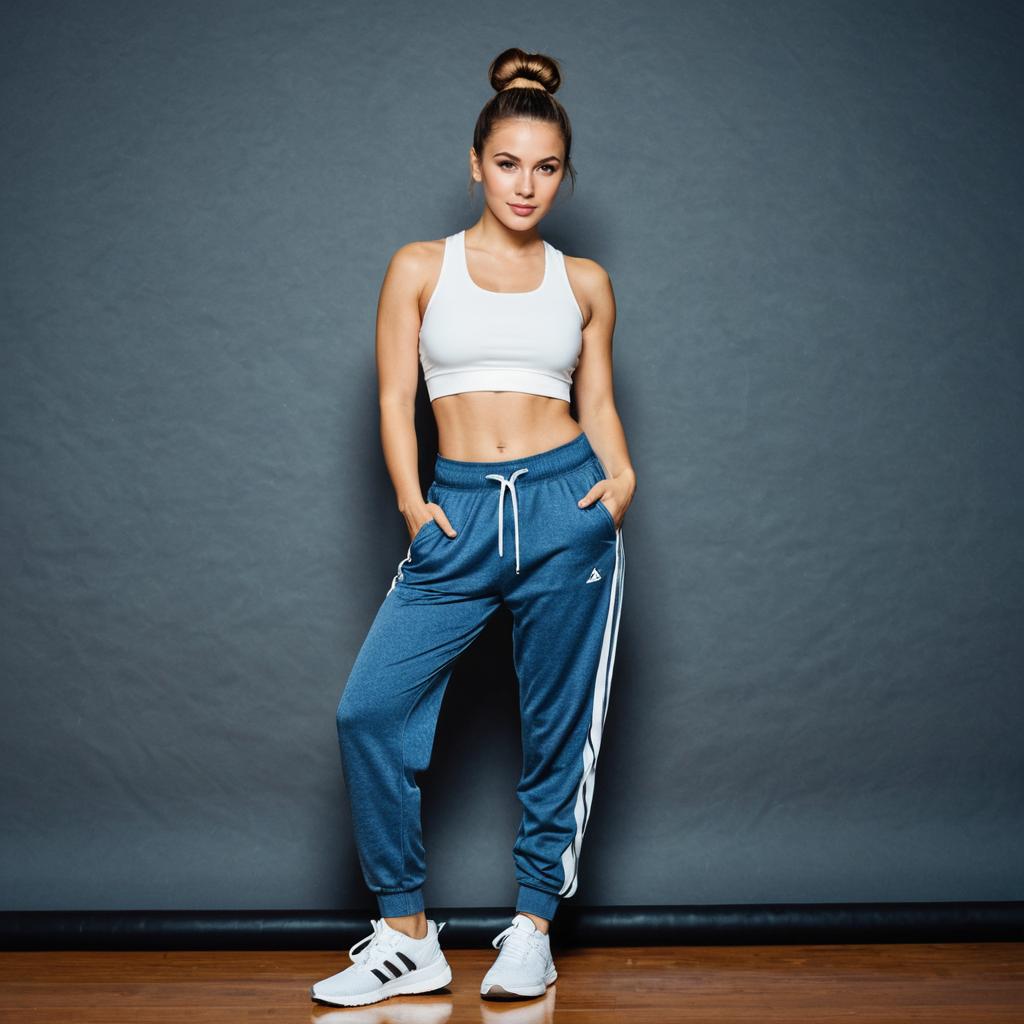Full body portrait of a young woman standing indoors against a plain wall. She has long brown hair and is wearing a white and blue sports bra, blue drawstring dance trousers, and white sneakers with blue accents. The image highlights sporty casual attire with a focus on comfort and style.
