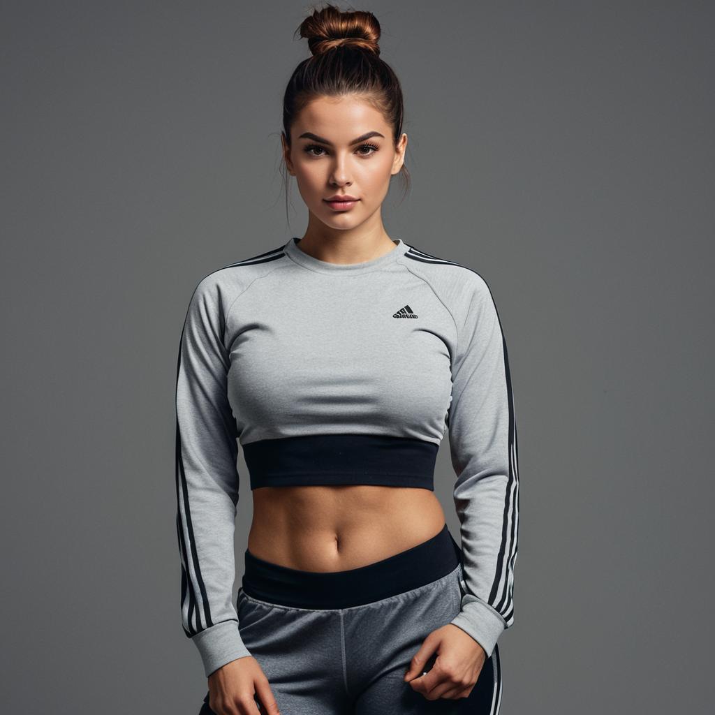 Dance trousers,1girl, solo, realistic, brown hair, pants, shoes, sneakers, midriff, crop top, full body, long hair, sports bra, standing