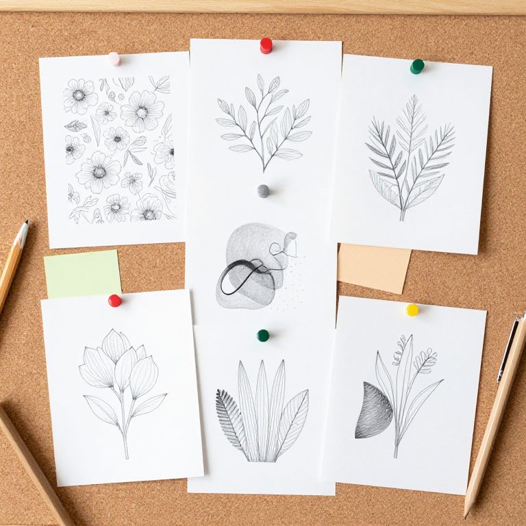 Drawing Pinterest style collage featuring a variety of artistic sketches, including floral patterns, abstract shapes, and delicate line art, arranged aesthetically on a corkboard with pinned colorful notes and art supplies scattered around, soft natural lighting.