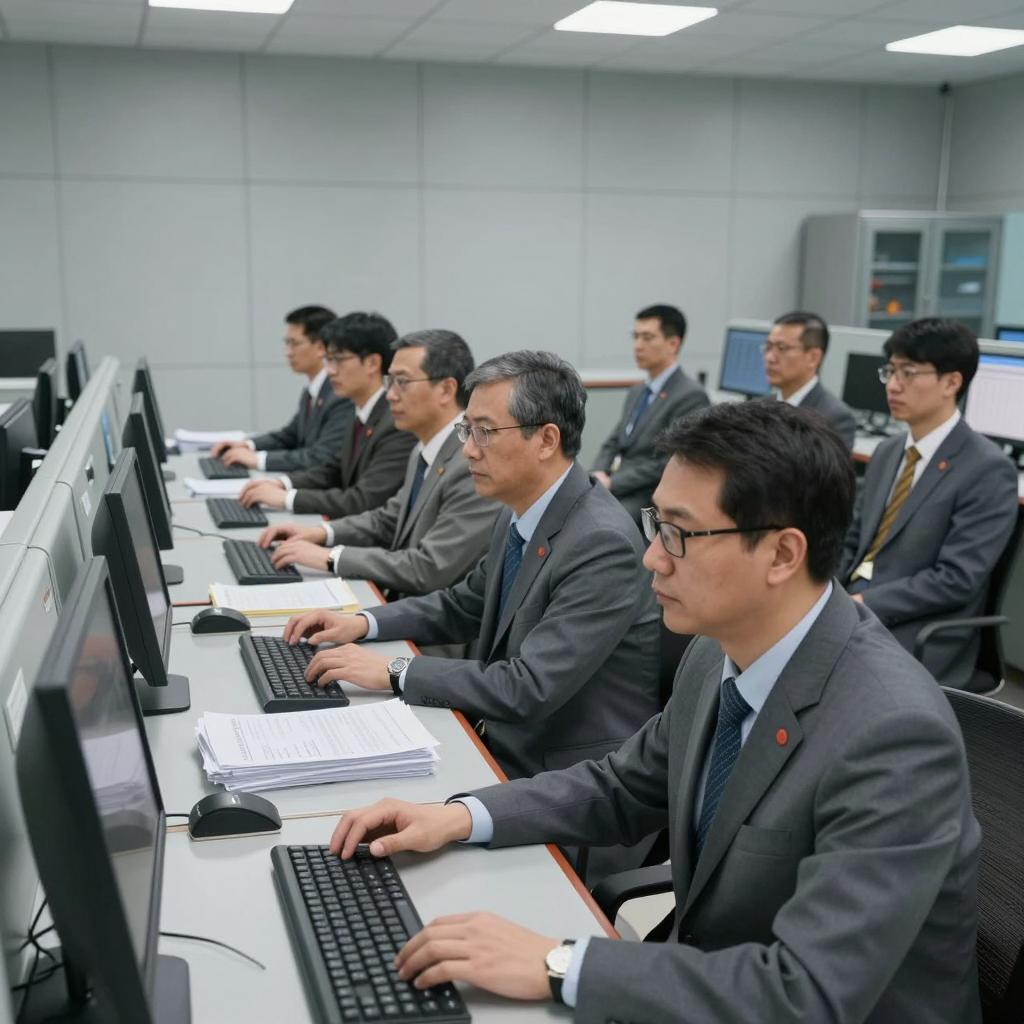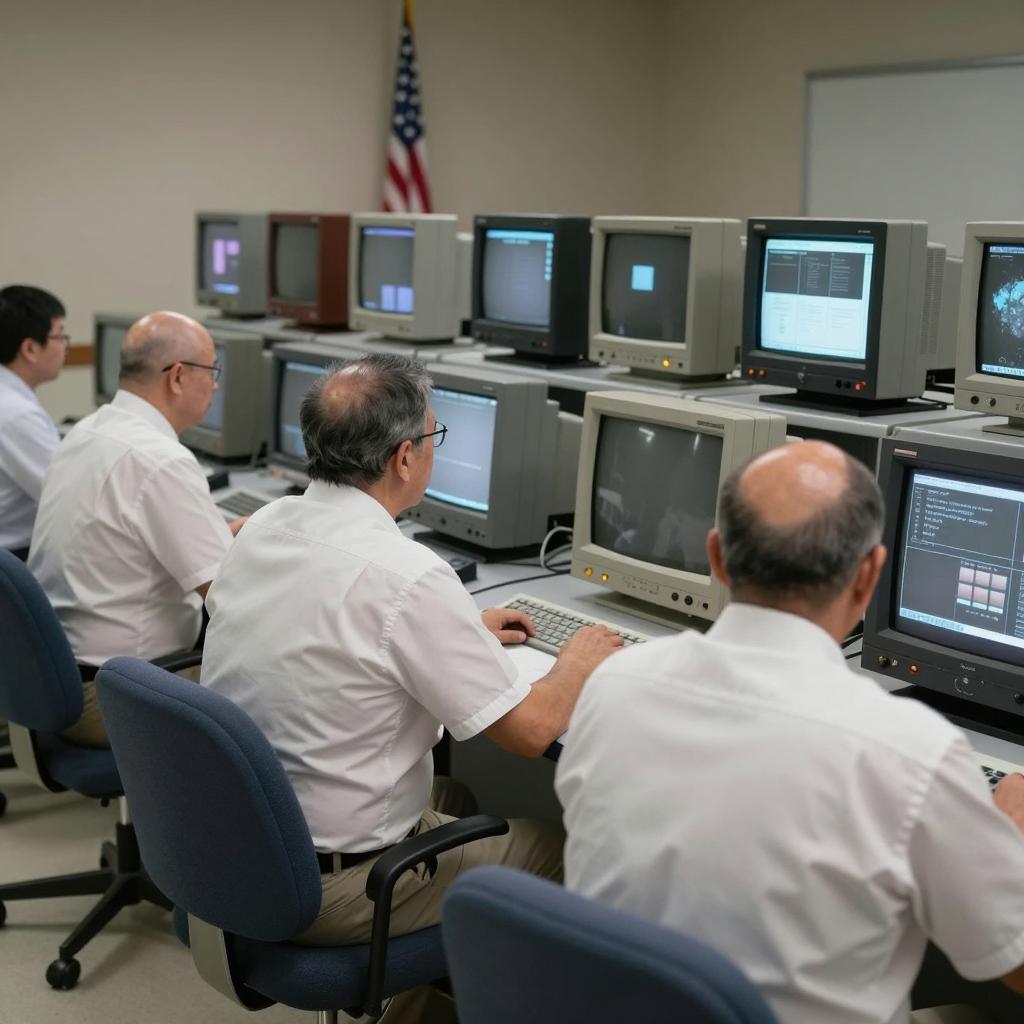 Control room with multiple gray, vintage CRT monitors in a row. Several people, mostly bald or with short hair, wearing white shirts, sit at desks in front of the monitors. American flag in the background. Dim lighting, cluttered workspace. Monitors display various and images. One person partially visible on the right, focusing on a monitor.