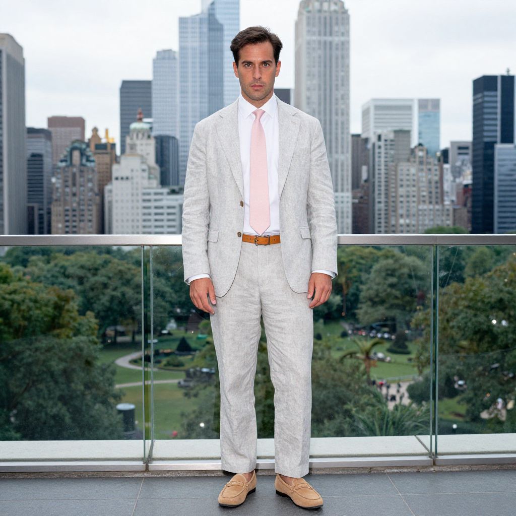 A man, light gray linen suit, white cotton dress shirt, pastel pink tie, tan suede loafers, coordinating tan leather belt, modern glass structure, bustling city skyline, lush green park below, medium format film, confident expression Man has masculine face and piercing eyes