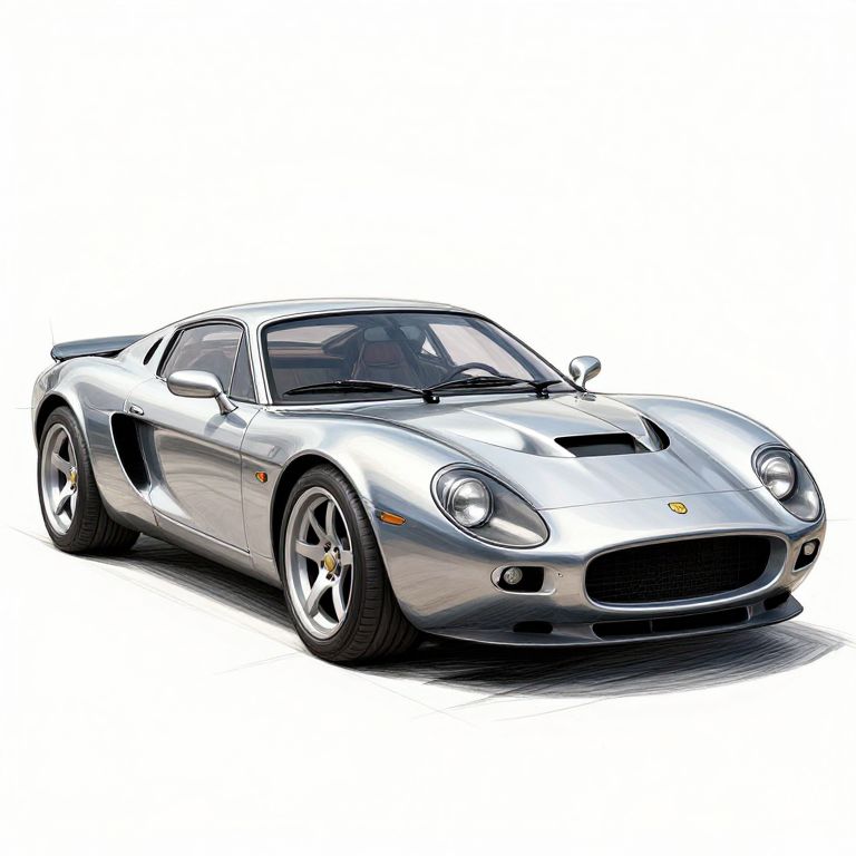 Rendered sketch of a classic sports car, crisp pencil rendering showing sleek curves and shiny surfaces, strong highlights and shadows enhancing the metallic texture, fine details on wheels and grills, artistic background with minimalist sketch strokes.