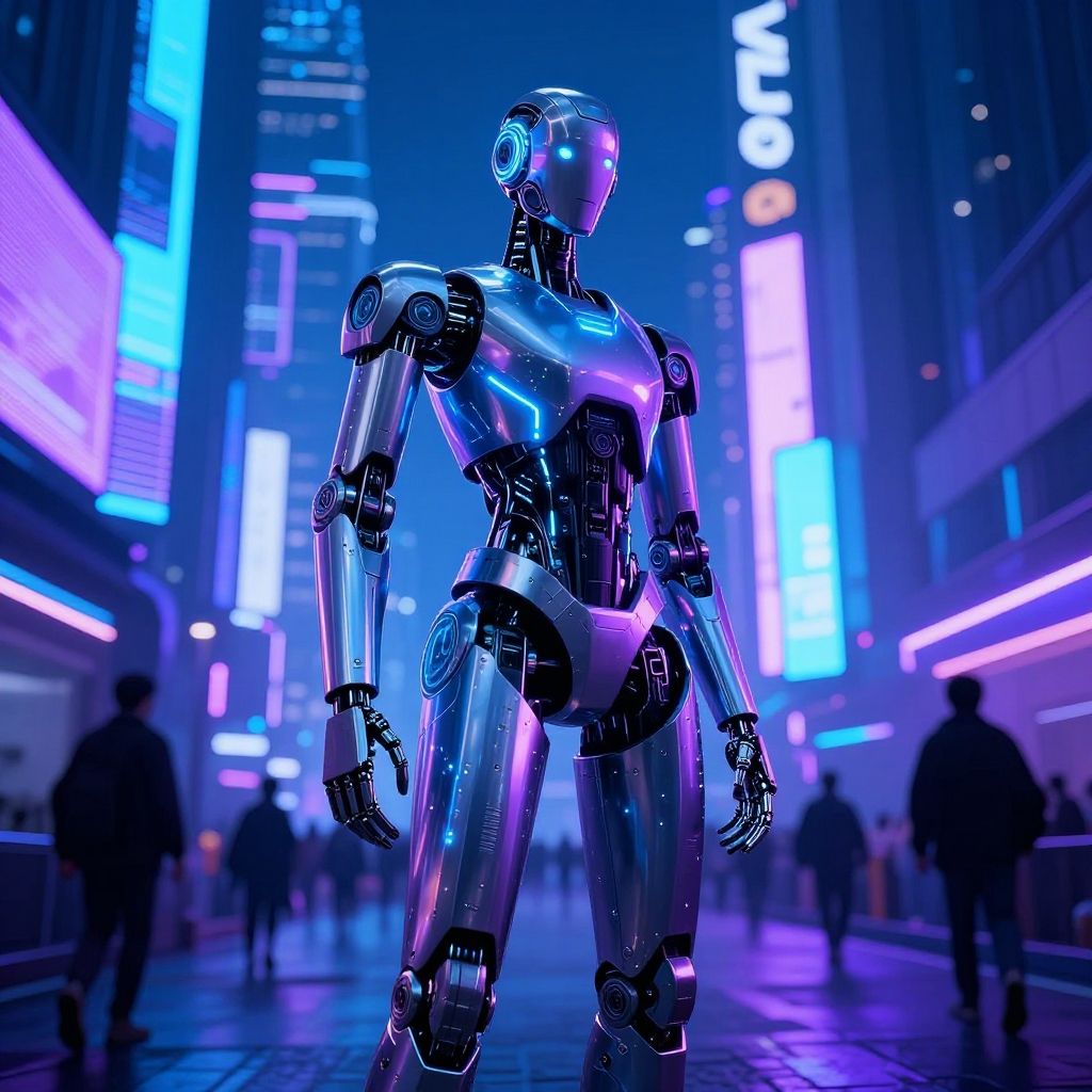 A sleek, humanoid robot stands prominently in a futuristic cityscape illuminated by vibrant neon lights in blue and purple hues. The environment features towering digital billboards and narrow streets filled with silhouettes of people, evoking a cyberpunk atmosphere. The robot's metallic armor glows with LED-like strips, reflecting the luminous urban surroundings.