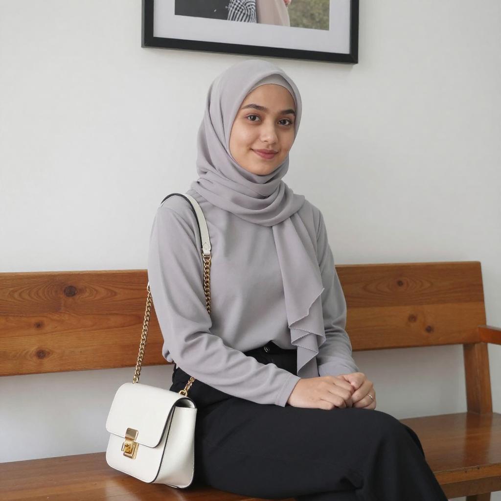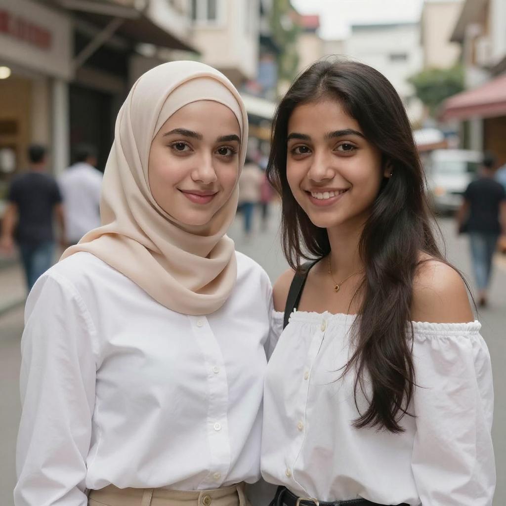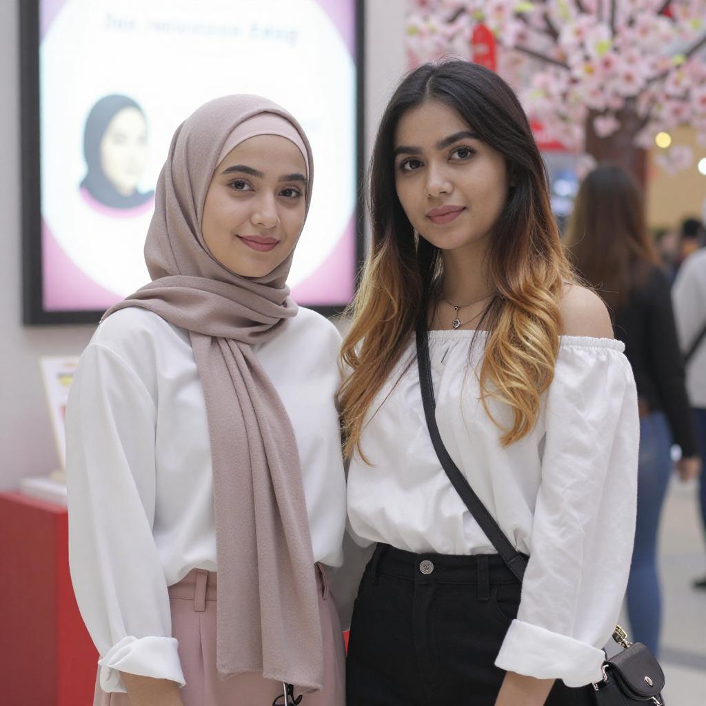 Photograph of two young women standing close together outdoors. The woman on the left has a light brown hijab, white blouse, and pink pants, smiling gently. The woman on the right has long, ombre hair, white off-shoulder blouse, and black crossbody bag, looking at the camera. Background includes a large, illuminated advertisement, pink cherry blossoms, and a red box.