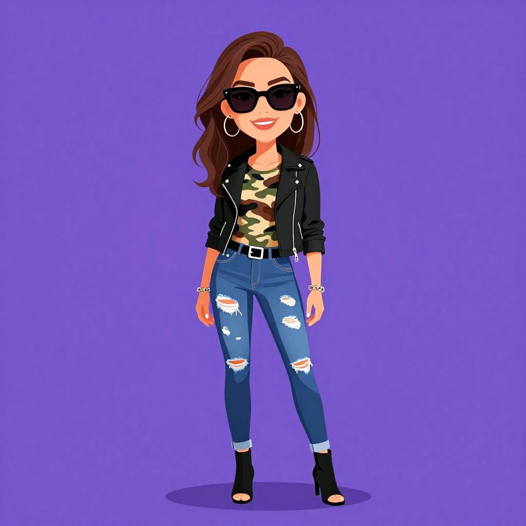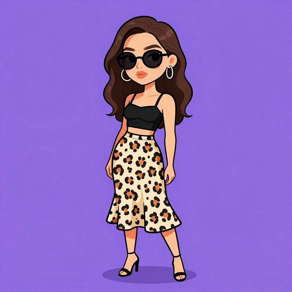 Illustration of a stylish woman wearing a black strappy crop top with a square neckline, paired with a high-waisted, flared leopard print skirt above knee-length. She accessorizes with oversized round black sunglasses, hoop earrings, and open-toe black heels. The woman has long brown wavy hair and stands confidently against a purple background.
