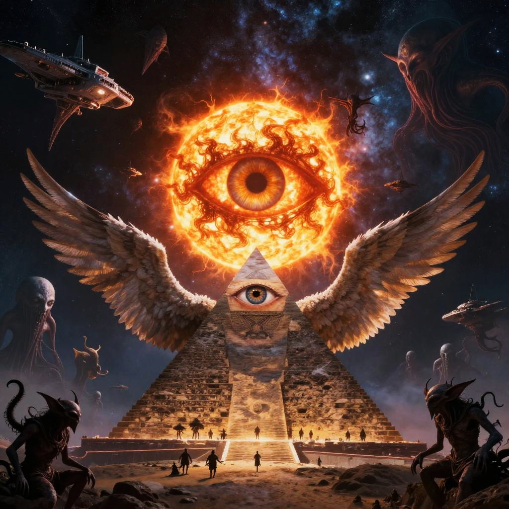 (a hyper realistic picture of a illuminati eye in a pyramid form with angel wings), flying in the sky, space backdrop, Digital art inspired by the cosmic horrors found in the works of Algernon Blackwood, An enigmatic space horror takes the form of a colossal eye within a grand sphere, Eldritch entities, reminiscent of Blackwood's creations, emerge as Cthulhu ominously consumes the sun, Thousands of humanity's last defenders, along with starships, embark on a desperate mission to thwart this cosmic threat, Crafted in mesmerizing high definition 8K, the celestial battleground unfolds against the backdrop of the Milky Way, partially obscured by cosmic shadows. Mind flayers, illithids, and abyssal demons inhabit deep space, engaging in a profound cosmic struggle, signaling an impending cataclysm, Horror-themed I stand amazed by the visionary genius of the artist, the exacting precision of every brush stroke making the canvas come alive with awe inspiring visuals, (illustration of a beautiful angel's final breath as she succumbs to death), angelic robes soaked in blood, the artist mourns the life of a fallen goddess, the death of virtuous saint to hands of evil, the eyes plead with the viewer to release them from their pain, (((intricate background of evil spirits in the shadows))), glow effects, Hand drawn, render, 8k, octane render, blender, dark, atmospheric 4k ultra detailed, cinematic, Sharp focus, big depth of field, Masterpiece, colors, 3d octane render, 4k, concept art, hyper realistic, Vivid colors, extremely detailed CG unity 8k wallpaper, Intricate, High Detail, dramatic, Eerie, unsettling, highly detailed