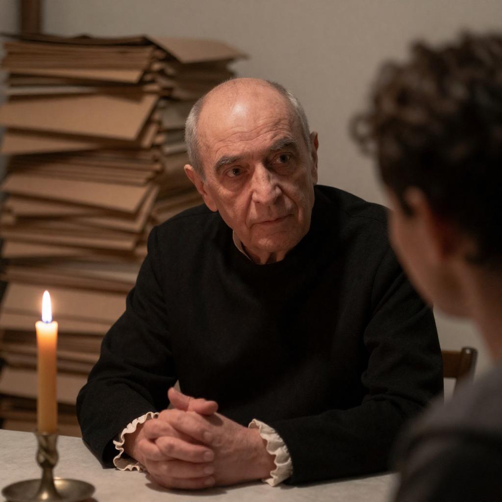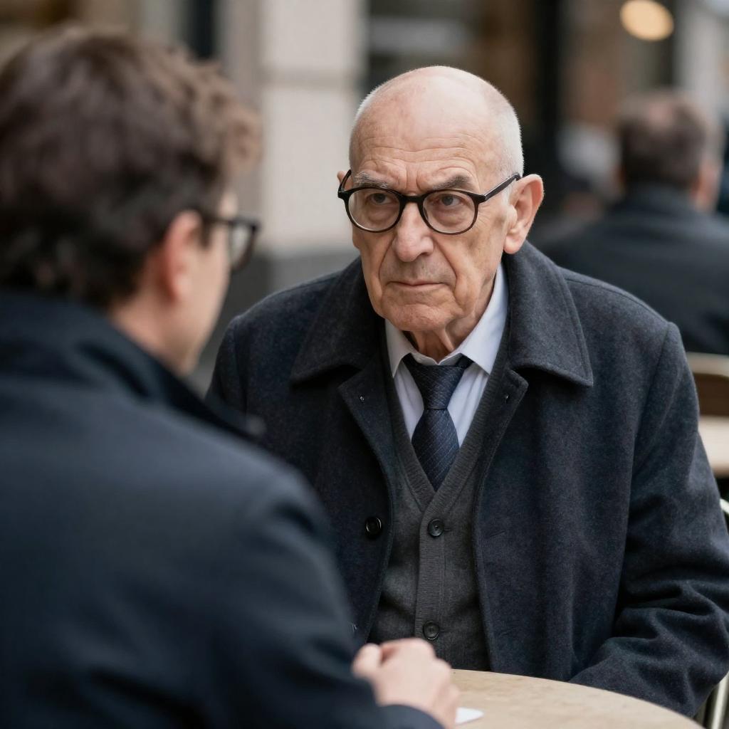 Old man with glasses, shocked expression, seated in wooden chair, being threatened by bald man in black jacket, gold chain, intense glare, holding wooden stick against his throat. Indoor setting, beige walls, shelf in background. Two people, intense interaction.