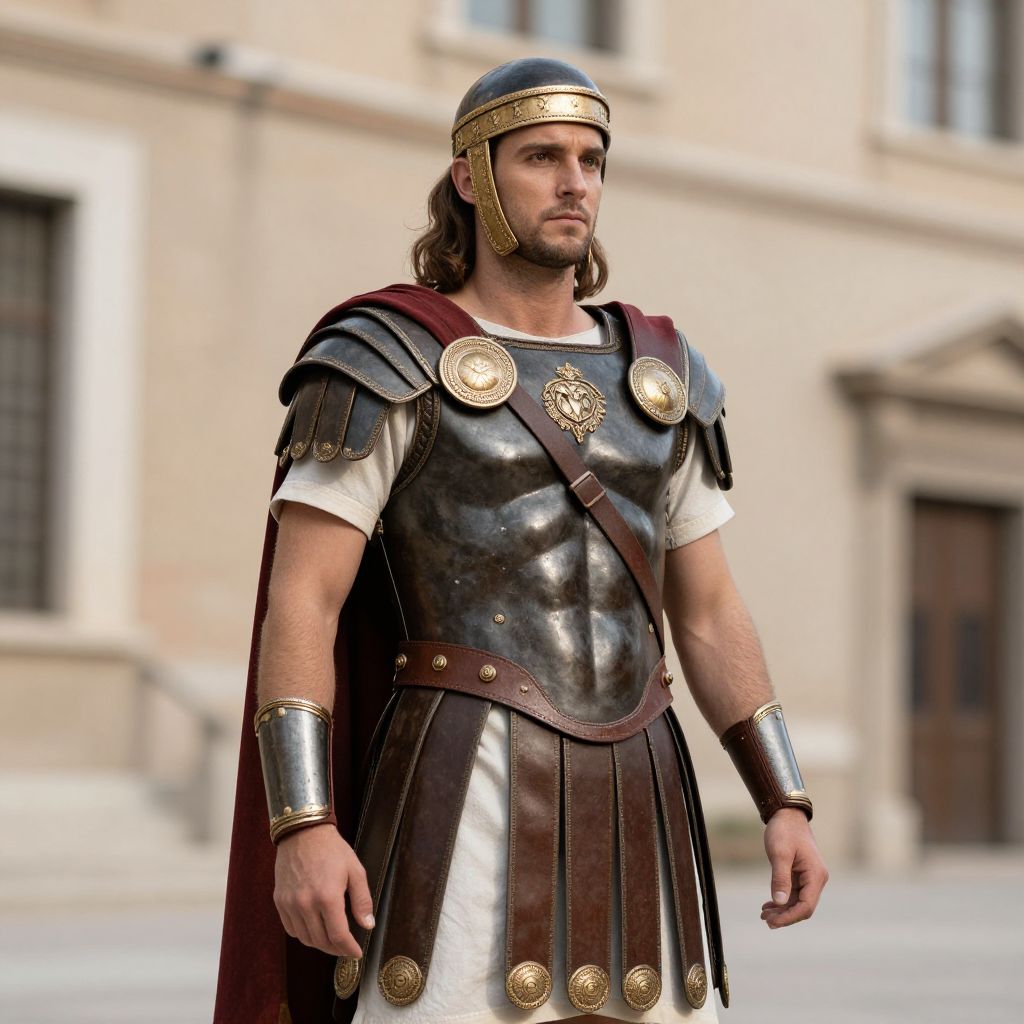 Ancient roman cosplay, man dressed in roman armor standing in front of a building