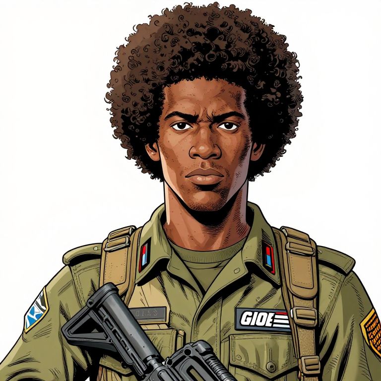 A detailed, hand-drawn vector illustration of a black African soldier with an afro, wearing a GI Joe 1980s TV show cartoon uniform, in the style of Larry Hama's comic book art, featuring high detail and line art.
