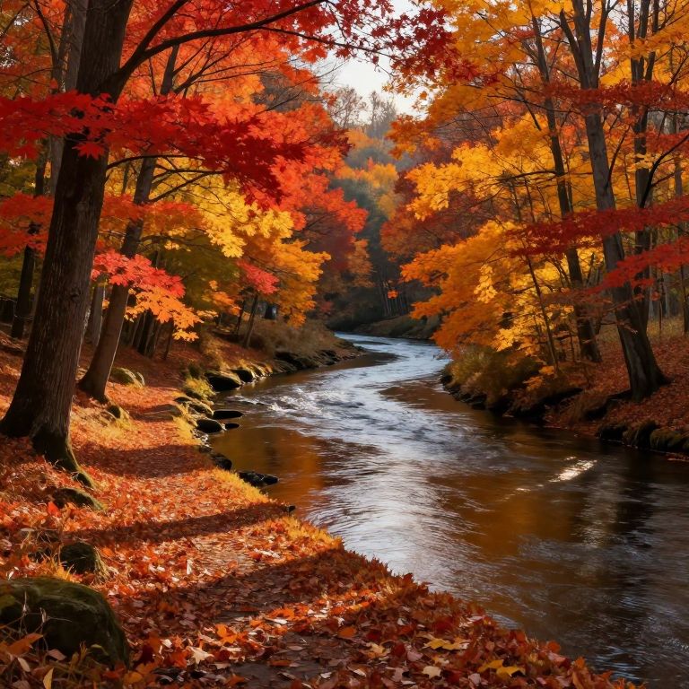 Beautiful autumn landscape with a winding river surrounded by colorful trees in shades of red, orange, and yellow, gentle sunlight casting long shadows on the fallen leaves, peaceful and nostalgic mood, hyper-detailed nature artwork